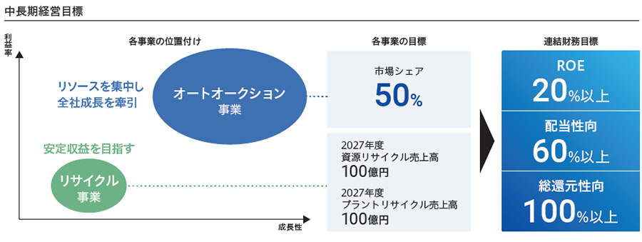 こうした状況のもと、USSは2025年度から中長期経営目標について、オートオークション事業にリソースを集中させ、後述する戦略プロジェクト「シェア50」の実現によって全社の成長を牽引する方針に転換しました。財務目標については、ROEを15%以上から20%以上へ、配当性向を55%以上から60%以上へ、総還元性向を2025年度から3か年で80%以上から100%以上へと引き上げます。